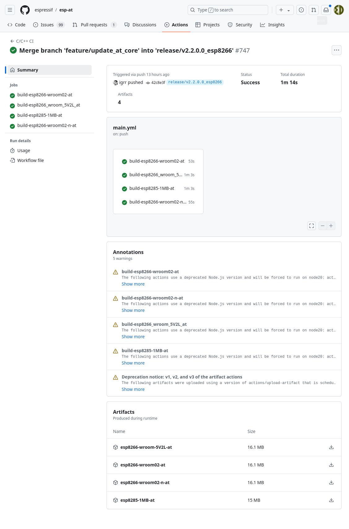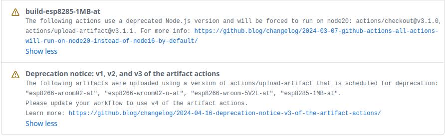 Actually, these notices were more than ominous. As late as October 25, the #707 commit c4d6f32 workflow, which at the time was the newest merged branch, would not produce artifacts. On the same day, the newest version of ESP-AT 2.2.2.0-dev(b65f53f - ESP8266 - Jul 5 2024 06:59:26) could be compiled against the newest version of the SDK (v3.4-84-ge19ff9af) following Bernhard Bablok's instructions without any difficulty. - New Toy