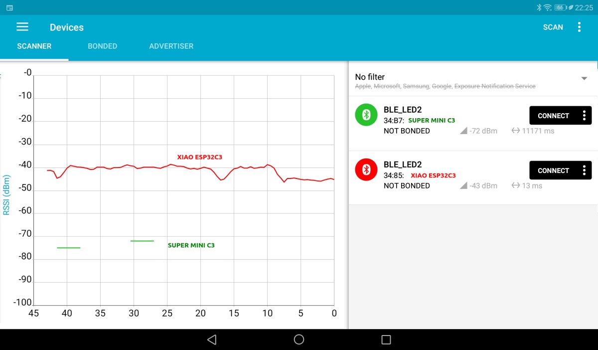 The important thing here is the performance of the Super Mini C3 cards. It is terrible. Sometimes the connection between the microcontroller and the Android tablet took a considerable. At other times, the tablet had to be very close to, practically touching, the microcontroller for the connection to be made. There were times when a connection could not be established at all, even though LightBlue found the Super Mini when scanning for devices. The XIAO-ESP32C3, on the other hand, was reliable showing that the problem cannot be attributed to the ESP32-C3. It may very well be located at the antenna again. Here the nRF Connect scan graph illustrates the difference.