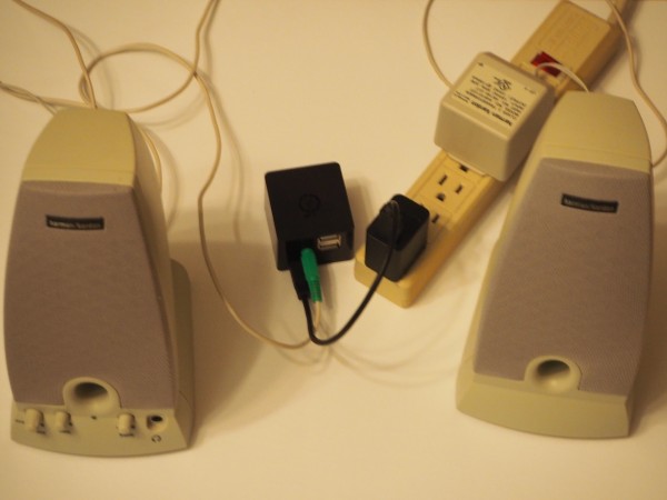 La première étape consistait à tester le matériel audio. J'ai éteint l'OPiZ, branché la carte d'extension, puis connecté des haut-parleurs alimentés à cette dernière. Quand tout est dans le boîtier acheté en même temps que l'Orange Pi Zero on obtient un système très compact, voire plus petit que l'alimentation des haut-parleurs.