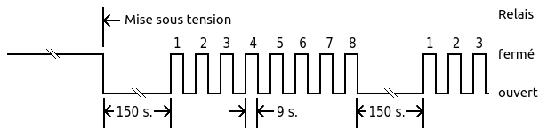 délai de 2,5 minutes pendant lequel le relais est ouvert, puis il est fermé