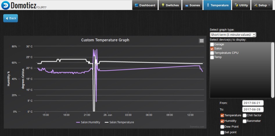 Ce serait un gaspillage de jeter un capteur de 1,25$ CDN. Pourquoi ne pas l'installer sur le Raspberry Pi qui héberge mon système de domotique? Il sera alors possible d'afficher les données dans Domoticz et éventuellement de garder un journal de la température et de l'humidité ambiante dans la maison.