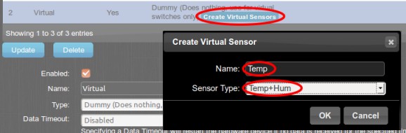 Nom(votre choix) etType de capteuren sélectionnantTemp+Humdans la fenêtre intitulée Create Virtual Sensor:
