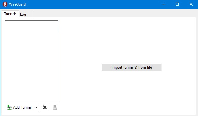 La première fois que le client est démarré en cliquant sur l'icône, une liste vide de tunnels est visible et il y a une option, Import tunnel(s) from file, pour importer la définition d'un tunnel ou de plus d'un tunnel ou connexion.