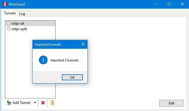 La configuration de cette instance de WireGuard tant que « client » ne peut être plus simple. J'ai utilisé FileZila pour copier les fichiers de configuration client.conf et client.all.con depuis le répertoire /home/pi/wg_config/users/tosh du Raspberry Pi. Ces fichiers ont été créés par le script users.sh comme expliqué ci-dessus. Après cela, j'ai renommé les fichiers de configuration en quelque chose de plus significatif