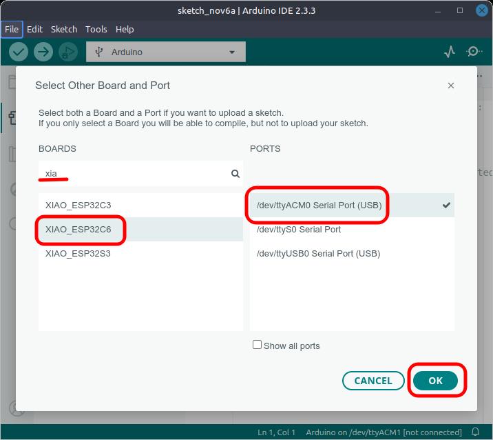 Start typing xiaooresp32c6in the search box. TheXIAO_ESP32C6should show up in the list. Presumably the correct serial port will be shown on the right. select both these elements and click on OK.