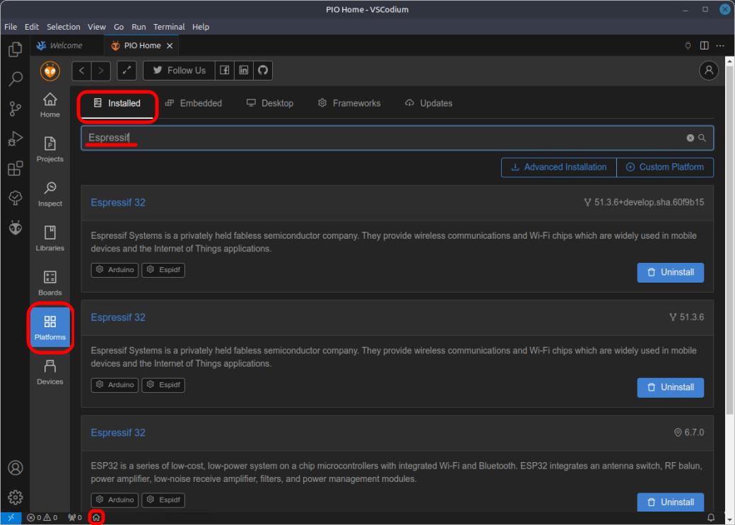 Basically that's it, don't bother trying to install the platform, just compile the project. PlatformIO will take care of downloading the development branch of the pioarduino platform and will install everything. Because of that, the first compilation will take longer. Later compilations will be much faster because the platform will not need to be installed again. Indeed once the first project is compiled, one can check which platforms are installed in the system.